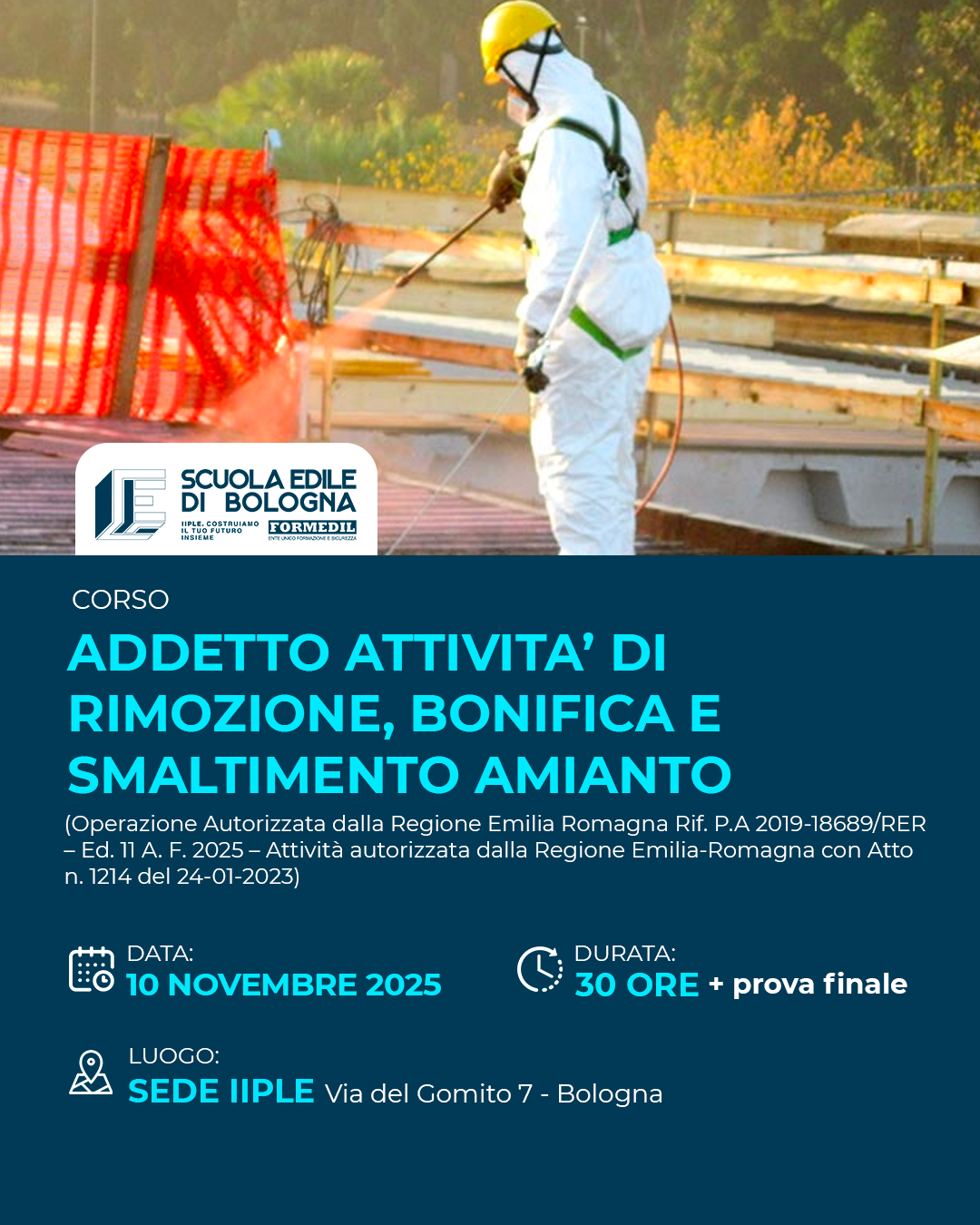ADDETTO ATTIVITA’ DI RIMOZIONE, BONIFICA E SMALTIMENTO AMIANTO Operazione Autorizzata dalla Regione Emilia Romagna Rif. P.A 2019-18689/RER – Ed. 11 A. F. 2025 – Attività autorizzata dalla Regione Emilia-Romagna con Atto n. 1214 del 24-01-2023