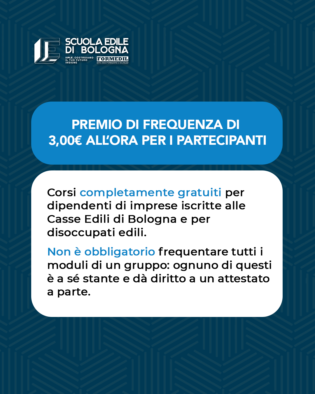 - lavoratori (operai e apprendisti operai) in stato di disoccupazione, che siano stati dipendenti di imprese iscritte alle Casse Edili di Bologna, licenziati causa crisi nei 6 mesi antecedenti l'iscrizione al corso.PREMIO CORSI PER LAVORATORI: