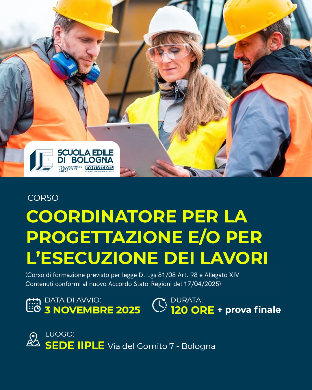 COORDINATORE PER LA PROGETTAZIONE E/O PER L’ESECUZIONE DEI LAVORI (Corso di formazione previsto per legge D.Lgs. 81/08 art. 98 e Allegato XIV) Contenuti conformi al nuovo Accordo Stato-Regioni del 17/04/25
