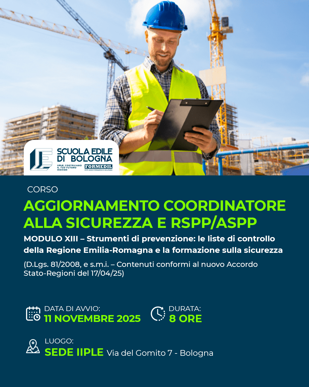 AGGIORNAMENTO COORDINATORE ALLA SICUREZZA e RSPP/ASPP – MODULO XIII – Strumenti di prevenzione: le liste di controllo della Regione Emilia-Romagna e la formazione sulla sicurezza (D.Lgs. 81/2008, e s.m.i. – Contenuti conformi al nuovo Accordo Stato-Regioni del 17/04/25)