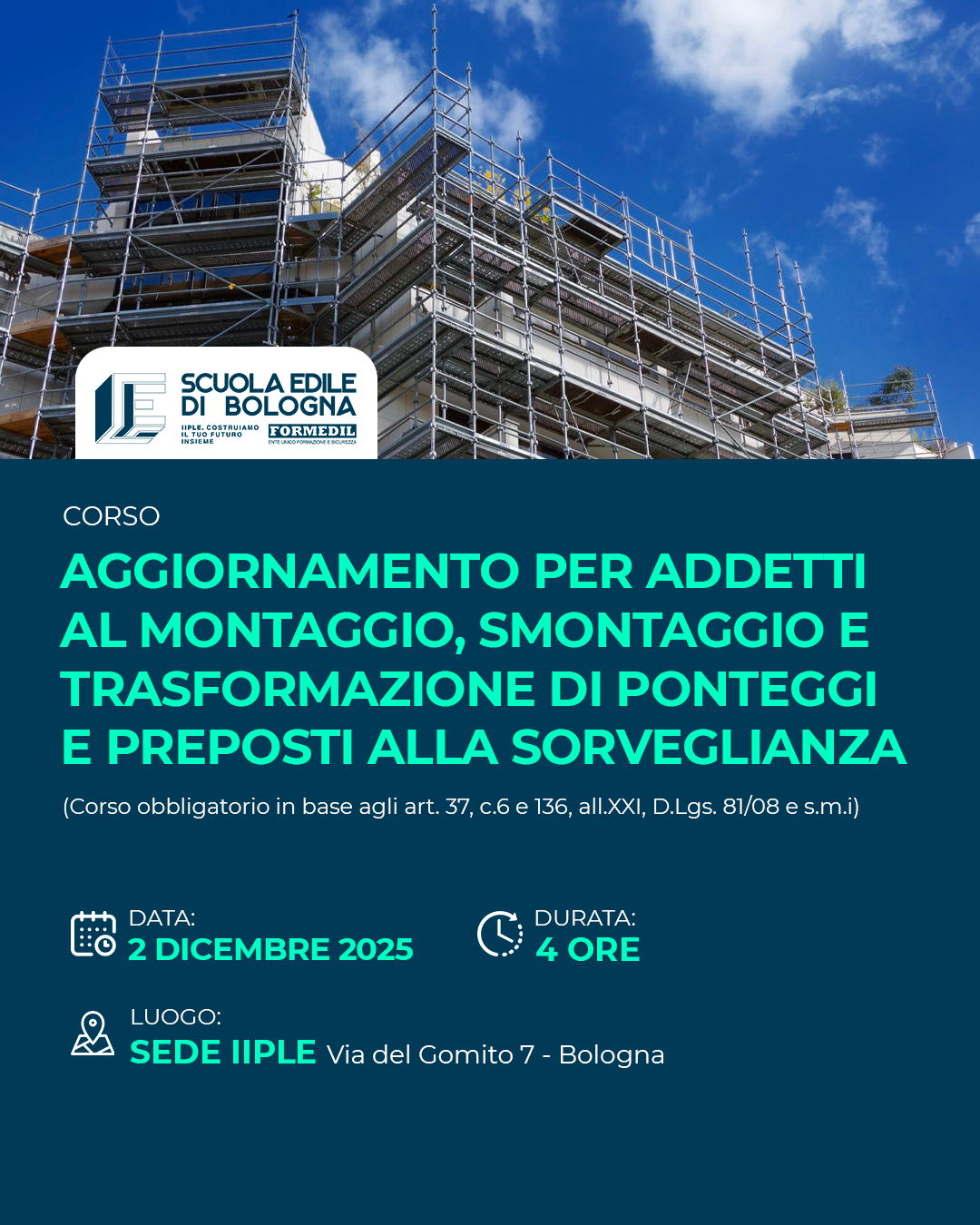 AGGIORNAMENTO PER ADDETTI AL MONTAGGIO, SMONTAGGIO E TRASFORMAZIONE DI PONTEGGI E PREPOSTI ALLA SORVEGLIANZA (Corso obbligatorio in base agli art. 37, c.6 e 136, all.XXI, D.Lgs. 81/08 e s.m.i)