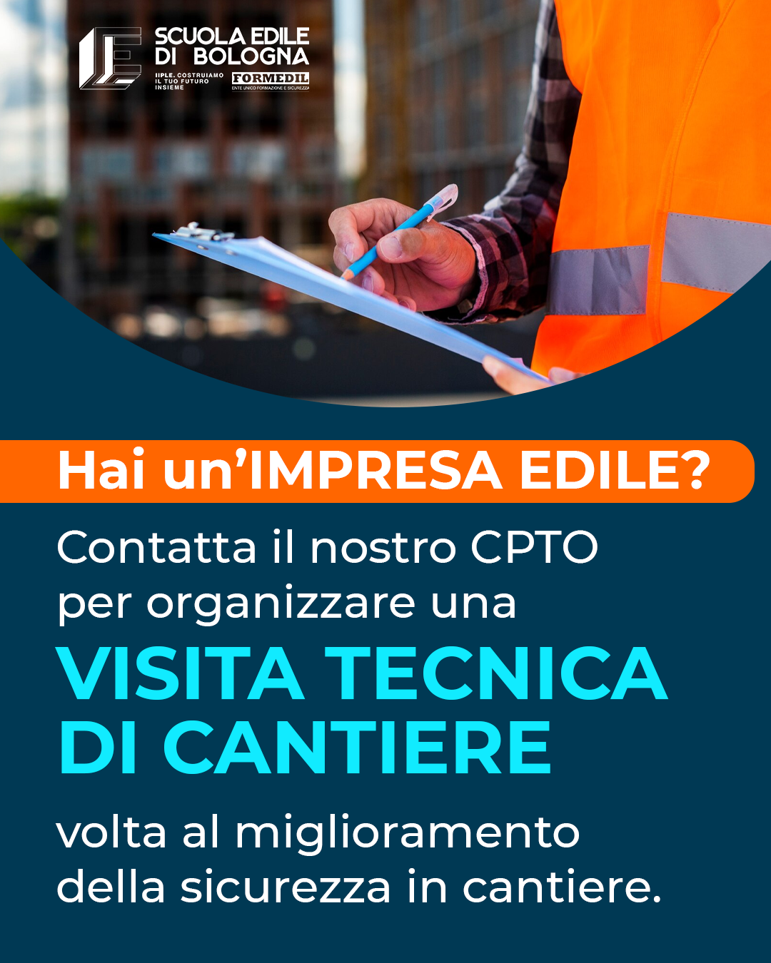 Con l’obiettivo di pervenire ad un generale miglioramento della sicurezza e dell’ambiente di lavoro in edilizia, il CPTO svolge il servizio di visite tecniche in materia di sicurezza e salute nei cantieri edili, rivolto a tutte le imprese del settore operanti nella provincia di Bologna, finalizzato a segnalare eventuali irregolarità riscontrate in materia di sicurezza e fornire ai Responsabili della sicurezza in cantiere le opportune indicazioni sulle misure da adottare per l’eliminazione o la riduzione dei rischi riscontrati.